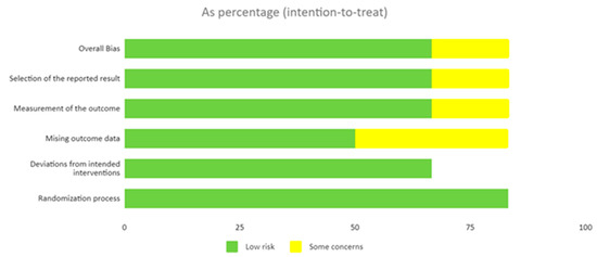 Assessment of the risk of bias in individual studies was performed as recommended by the Cochrane Collaboration Handbook. Version 2 of the Cochrane risk-of-bias tool for randomized trials (RoB 2) is a recommended instrument to assess the risk of bias in randomized trials included in a systematic review [33]. RoB 2 is structured into a fixed set of bias domains, focusing on different aspects of trial design and reflecting current understanding of how causes of bias may influence study results and the most appropriate ways to assess this risk. Each domain was classified as “low risk of bias”, “some concerns” or “high risk of bias” [34,35].