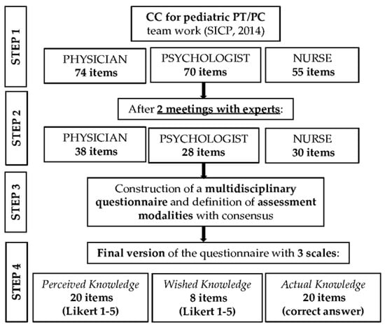 A multidisciplinary group of experts, including two physicians, two nurses, two psychologists with experience on PPC and continuity of care for CWSHCN and one health professional education expert contributed to the questionnaire development. The basis for the instrument development was the CC, which identifies eight common areas of competence in the training curricula of nurses, physicians and psychologists: (1) To evaluate the child and family for the access to the PPC/PT network, (2) To receive the child and family in the PPC/PT network, (3) To take charge of the child and family in the different settings of the PPC/PT network, (4) To know how to work as a team, (5) To know how to manage self, (6) To know how to activate and manage a reference center for PPC/PT, (7) To know how to train on PPC/PT, and (8) To know how to conduct research on PPC/PT. The CC also lists knowledge, skills and training strategies for each professional in each area, at different levels. In particular, the CC was used to create items investigating Perceived and Wished Knowledge. To measure the Actual Knowledge, we extracted 60 multiple choices questions from the written assessments used in the evaluation of learning outcomes of five previous accredited events of medical continuous training on PC/PPC conducted by an Italian regional training provider. Questions were formulated by teachers with adequate expertise on PC/PPC who have participated in those events. The selection of the final relevant questions for the CC competence areas suitable to a multidisciplinary assessment of Actual Knowledge (nine questions) was based on a consensus after independent and group evaluation by the researchers. The selected questions were slightly edited to be adapted for the online format and increase the comprehensiveness and clarity, following educational research guidelines about assessment modalities (i.e., answer possibilities, and type of written questions) [,]. The development process of the questionnaire included four sequential steps and is described in Figure 1. The final questionnaire in Italian is presented as supplementary Table S1.