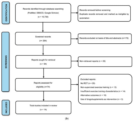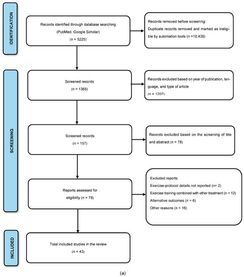 In the animal studies, titles and abstracts were screened to exclude the following: reviews; studies without reported details of exercise training protocols, such as time, intensity, duration, or type of exercise; studies combining exercise programs with other interventions, such as diet supplement, nutritional strategies, or drugs administration; studies focusing on different outcomes, such as insulin sensibility, cancer, lipids profile, prothrombotic state; studies of molecular pathways not involved in the resolution of NAFLD; and studies published in languages other than English. For human studies, the use of supplements or drugs as part of the intervention to manage NAFLD, as well as studies with insufficient information on the characteristics of the exercise (type, intensity, frequency, duration per session, and duration of the intervention), were excluded; studies including subjects younger than 18 years old, non-full-text articles, and non-English language studies were also excluded.