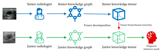 The framework we proposed relies on knowledge tensor inference for medical-image-assisted diagnosis. Knowledge tensor is a knowledge graph inference method based on tensor decomposition. The construction and inference methods of knowledge tensor are elaborated in Section 2.3 and Section 2.4. The entire framework is shown in Figure 1. Knowledge from senior radiologists and junior radiologists is collected and utilized to construct knowledge graphs. That is to say, the senior annotations are utilized to construct the senior knowledge graph, and the junior annotations are utilized to construct the junior knowledge graph. The two knowledge graphs were independent when we constructed them. Then, tensor decomposition is utilized to decompose each piece of knowledge into tensors. Senior knowledge tensors are next used to correct the tensor space mapping of junior knowledge tensors. Finally, corrected junior knowledge tensors could infer the diagnosis results.