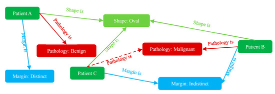 where denotes patient A, denotes there is a hyperechoic area in patient A’s BUS images, and denotes that triple represents the relation about echogenicity. Then, we can abstract the representation of knowledge in the form of a triple from Equation (1):
