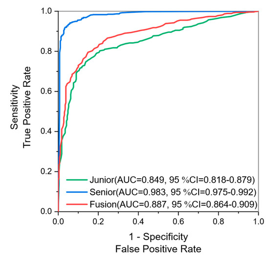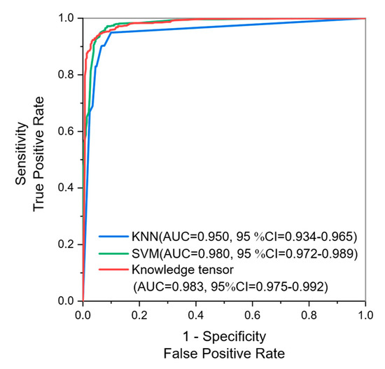 We conducted the experiments with the junior knowledge tensor, the senior knowledge tensor, and the fused knowledge tensor. As shown in Table 1, the proportion of benign and malignant cases is relatively disparate. Therefore, we used random undersampling to keep the ratio of benign to malignant samples at 1:1. This was because the TuckER model is calculated and optimized based on tensor space distance and, thus, is sensitive to the equilibrium of positive and negative samples, so we balanced the proportion of positive and negative samples. Through undersampling, the number of both benign and malignant images is set at 746 from 826 cases in total. We then utilize five-fold cross-validation to prevent overfitting and, thus, go on to better evaluate the accuracy of the auxiliary diagnosis. We find the optimal learning rate and the number of iterations through a grid search method. Test metrics of each method are shown in Table 2. The ROC curve is shown in Figure 3.