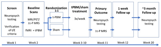 The risks associated with this study include risks of the t-PBM and of the neuroimaging procedures utilized. t-PBM has a favorable safety profile as demonstrated by previous studies [33,59,60,61]. Neuroimaging procedures (especially PET, which includes a radioactive tracer) also carry a small safety risk. Extensive safety data will be collected (as described in Section 2) to monitor and evaluate these risks.