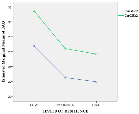 Since we are primarily interested in knowing if and how psychological resilience and alcohol abuse influence aggression, we employed a two-way ANCOVA to determine whether there is an interaction between psychological resilience and alcohol abuse in terms of aggression, after adjusting/controlling for age, working experience, and DAR-5 scores as covariates. Results reveal no statistically significant interaction between psychological resilience and alcohol abuse, whilst controlling for the above covariates, F(2, 232) = 0.015, p = 0.985, partial η2 = 0.010, (Figure 1). Similarly, we investigated if gender interacts with psychological resilience in terms of aggression following the same procedure and results evidenced no statistically significant interaction between psychological resilience and gender, whilst controlling for age, working experience, DAR-5, and CAGE scores as covariates (F(2, 231) = 0.891, p = 0.412, partial η2 =0.008), (Figure 2).