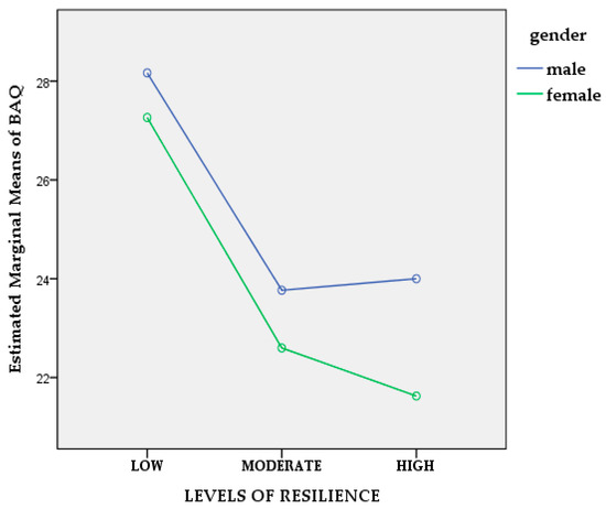 Line plot of gender and levels of resilience for aggression.