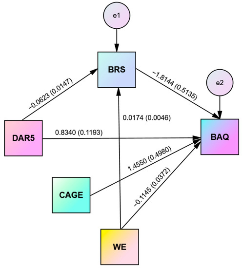 Mediation Analysis of BRS on the DAR-5 and BAQ relationship with Alcohol Abuse and Work Experience (W.E.) as Covariates.