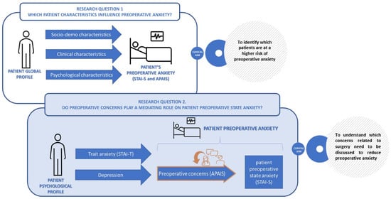 - To identify patients’ socio-demographic, clinical and psychological characteristics that most contribute to preoperative anxiety. According to Spielberg, anxiety can be distinguished into trait anxiety, as a stable feature of personality, and state anxiety, as the degree of anxiety at a particular time []. The latter is the type of anxiety considered in our study, and defined as preoperative anxiety preceding pancreatic surgery.