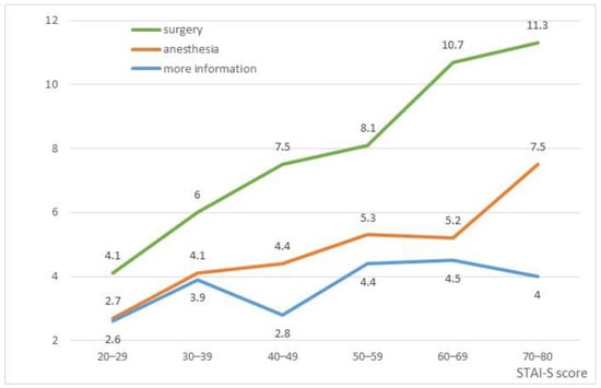 In a meta-analysis, Abate et al. [] evaluated 14,652 surgical patients in 17 countries and found that the universal preoperative anxiety prevalence was 48% (95% CI: 39–57%). There are also copious studies that indicate that a high level of preoperative anxiety negatively affects the intervention itself and the subsequent recovery. High anxiety levels lasting for a prolonged time have been shown to affect neuroendocrine functions, increasing the need for anesthesia and analgesics [,,], intensifying post-operative pain severity [,], lengthening recovery time from anesthesia [], increasing post-operative mortality [,] and contributing to postoperative delirium [].