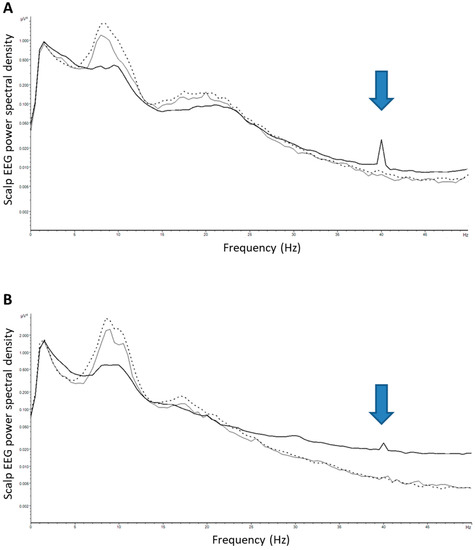 AlzLife 40 Hz light and sound stimulation entrains cortical regions. Scalp EEG power spectral density (PSD) at the frontal (FCz) electrode (A) and the occipital (POz) electrode (B) sites (n = 3). Solid black line: 40 Hz light and sound stimulation (active condition), group average; grey thin line: pre-stimulation baseline; dotted line: post-stimulation baseline. All 3 participants demonstrated the 40 Hz peak marked by an arrow.