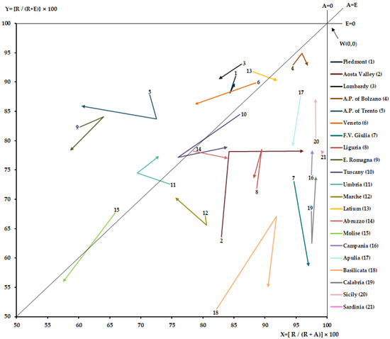 - The upper-left quadrant describes the catchment areas “marked oriented”, in which are admitted more patients attracted than residents and escapes are less than attractions and residents admission (E < R < A). At the point X = 0 and Y = 100 is shown the paradoxical condition in which are admitted only attracted patients and there are no escapes.