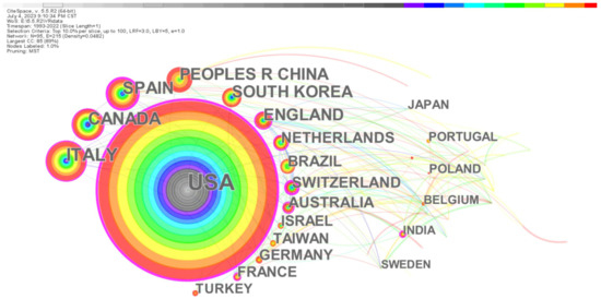 Table 1 presents information about the top ten countries/regions in terms of the number of publications. The United States topped the list with 1088 articles, accounting for more than 31% of the total, which demonstrates the importance that the United States attaches to this research field. Italy, Canada, Spain, China, and South Korea have all published more than 200 articles. The top 10 countries and regions accounted for more than 84% of the total number of articles published, indicating that the main research strength on the application of VR in rehabilitation medicine is concentrated in these countries and regions. Centrality is adopted to measure the importance of nodes in a network and is a key metric of interest in the fields of data visualization and scientometrics. Therefore, in CiteSpace, the centrality of each node (e.g., countries, keywords, and literature) is calculated to discover and assess its importance. This is achieved by highlighting nodes with high centrality using purple circles. With regard to centrality, the United States ranked first with 0.36, followed by Spain and Australia, ranked second and third with 0.21 and 0.2, respectively. These country/region nodes are marked with purple circles to indicate the importance of the node. The United States started publishing relevant articles in 1997; Italy (2000), England (2001), Canada (2003), and South Korea (2003) commenced relevant studies in approximately 2002, and other countries/regions started publishing relatively later and began publishing after 2007. It is evident that the United States has a comparative advantage in terms of both the number of articles and their significant impact.