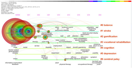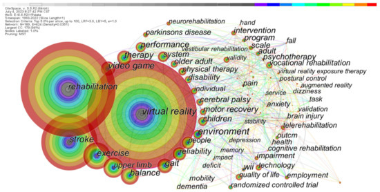 By analyzing the keyword co-word network of the literature, the relevance of keywords to the research focus in specific academic fields can be explored. Figure 3 shows the co-word network of keywords generated by CiteSpace. Every node stands for a keyword. The larger the node is, the higher the occurrence frequency of the keyword. The color bar at the top of the figure represents the year changes. The earliest is on the left, and the more to the right one looks, the newer the year. Additionally, the different colors in the node describe the occurrence frequency of the keyword in different periods; thus, the year of the center of the circle is the earliest. The node with high centrality is marked with a purple outer ring to present the importance of the keyword. Among them, the significant nodes with high frequency and centrality include virtual reality (1924 times, 0.16), gait (306 times, 0.1), video games (281 times, 0.14), and environment (233 times, 0.15), all of which are key issues in this research field. In addition, keywords with high word frequency include rehabilitation (1666 times), stroke (1034 times), exercise (537 times), balance (360 times), children (208 times), older adults (173 times), cerebral palsy (159 times), telerehabilitation (115 times), and Parkinson’s disease (109 times), which offer a reference for the following review of research themes.