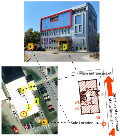The time it took a subject to leave the building and find a safe place was used as a measure of the initial emergency response. We established the length of time required for a subject to reach the safe area, which had been previously selected according to the building’s fire protection plan (Figure 1) [24].