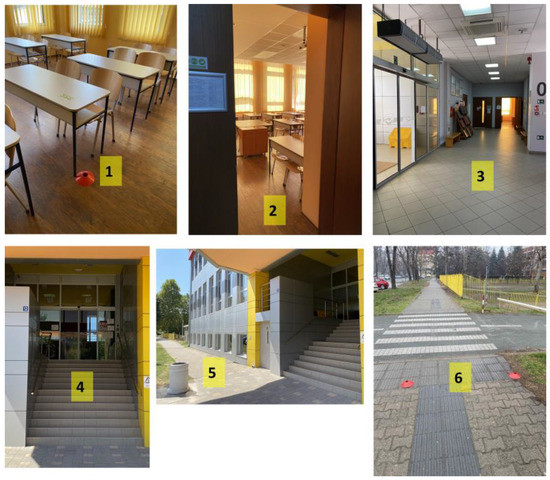 Evacuation route for the tested subjects according to the test scenario: (1) starting position in the selected classroom, (2) entrance to the classroom, (3) the hall between the classroom and the main entrance, (4) the main entrance to the building and the 13 stairs to the exterior of the building, (5) path from the entrance to the safe location, and (6) the safe location.