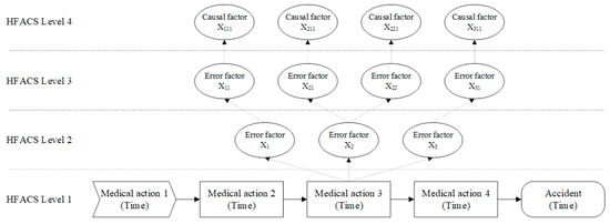 With the increased amount of research on human errors, several human error analysis methods and classification models have been developed, including the HFACS, SHELL model, root cause analysis, human error assessment and reduction technique, the technique for the retrospective and predictive analysis of cognitive errors, and systematic human error reduction and prediction approach. Compared with other methods, HFACS provides a relatively comprehensive analysis framework that considers behavioral, managerial, and organizational factors and is widely used for accident analysis in aviation safety [1,18,19,20,21], patient safety [2,22], railway and marine safety [23,24], the oil and gas industry [25], and other fields. The HFACS was developed by Wiegmann and Shappell (2012) based on the Swiss cheese model [14], which provides a relatively complete structural framework for human error analysis [26]. The HFACS divides error factors into four main categories: unsafe acts (level 1), preconditions for unsafe acts (level 2), unsafe supervision (level 3), and organizational influences (level 4). Unsafe acts represent medical staff behavior that directly or indirectly contributes to medication-related adverse event occurrence during medical practice, such as decision errors and skill-based errors. Preconditions for unsafe acts refer to the potential causes of unsafe acts, including physiological, psychological, and environmental issues, such as adverse mental states and physical/mental limitations. Unsafe supervision indicates supervision problems in medication-related adverse events, such as inadequate supervision or failure to correct problems, which may lead to preconditions for unsafe acts. Organizational influences represent the problems within the healthcare systems that affect supervision and personnel behavior, often perceived as the root cause of medication-related adverse events, such as resource management and organizational climate.
