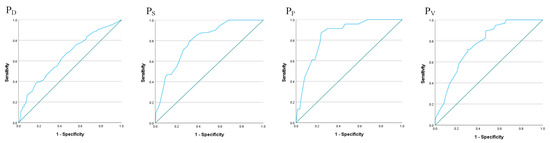 Using a top-down error pathway (organizational climate → planned inappropriate operations → adverse mental states) as an example, the estimated occurrence rates for decision errors, skill-based errors, perceptual errors, and violations were calculated using Equations (4)–(7). In the top-down error pathway, the occurrence rates of decision errors, skill-based errors, perceptual errors, and violations were 32.6 %, 46.6 %, 8.3%, and 14.5%, respectively. Based on logistic regression analysis, the precision of the estimated occurrence rate for error factors, including decision errors, skill-based errors, perceptual errors, and violations, was 58.9%, 80.6%, 90.7%, and 78.2%, respectively. The Hosmer–Lemeshow test was applied to test the goodness-of-fit (GOF) of the equations. The GOF results indicated that Equations (4)–(7) fit the observed data well (the p-values in Equations (4)–(7) were 0.946, 0.403, 0.610, and 0.995, respectively). The predictive accuracy of the model was additionally evaluated using AUC-ROC curves (Figure 2). The results showed that the AUC test values for Equations (4)–(7) were 0.647, 0.799, 0.848, and 0.767, respectively. Six top-down error pathways were randomly selected as examples to illustrate the different occurrence rates of error factors in HFACS level 1, as presented in Table 2.