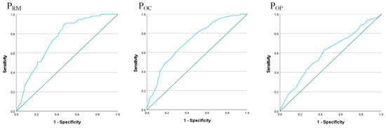 Using a bottom-up error pathway (skill-based errors → adverse physiological states, and → planned inappropriate operations) as an example, the estimated occurrence rates for resource management, organizational climate, and organizational processes were calculated using Equations (8)–(10), respectively. In the bottom-up error pathway, the occurrence rates for resource management, organizational climate, and organizational process were 23.0%, 24.9%, and 36.4%, respectively. From the logistic regression analysis, the precision of the estimated occurrence rate for error factors, including resource management, organizational climate, and organizational process, was 76.6%, 71.8%, and 58.1%, respectively. The Hosmer–Lemeshow test was applied to test the GOF of the equations in this study. The GOF results indicated that Equations (8)–(10) fit the observed data well (the p-values in Equations (8)–(10) were 0.613, 0.767, and 0.855, respectively). The AUC-ROC curve was used to assess the predictive accuracy of the model (Figure 3), and the results showed that the AUC test values of Equations (8)–(10) were 0.603, 0.723, and 0.745, respectively. Six bottom-up error pathways were randomly selected in this study as examples to illustrate the different occurrence rates of error factors in HFACS level 4, as presented in Table 3.