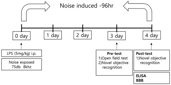 We used an animal model of septic encephalopathy, our LPS-treated mouse model with induced systemic inflammation, to model patient conditions in the ICU (Figure 1). Many previous studies have modeled septic encephalopathy by administrating LPS intraperitoneally to mice at dosages ranging from 3 to 70 mg/kg [25,26,27,28,29,30]. In the present study, LPS (5 mg/kg) was administered to mice using intraperitoneal injection. The mice were randomly divided into the vehicle-treated group (sham control), LPS-treated group (LPS: 5 mg/kg), noise exposure group (75 dB noise), and LPS-treated + noise exposure group (LPS: 5 mg/kg + 75 dB noise).