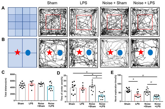 Assessment of mouse neurobehavioral function. (A) Representative trajectory movement of mice in (A) OFT and (B) NORT. (C) Total distance and (D) percentage of time in the center zone during OFT. The LPS-treated + noise exposure group had a significantly shorter staying time rate compared with the sham control group and noise + sham group (n = 8~11 per group) (p < 0.05). (E) Discrimination time rate for novel objects in the post-trail of NORT. Discrimination time rate was significantly (p < 0.05) decreased in the LPS-treated + noise exposure group compared to the sham control group and sham + noise exposure group (n = 8~11 per group). * p < 0.05 and # p < 0.001. LPS, lipopolysaccharide; OFT, open-field test; NORT, novel objective recognition test.