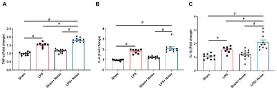 Comparison of pro-inflammatory cytokines in hippocampal tissue. The level of (A) TNF-α, (B) IL-6, and (C) IL-1β was measured in 4 groups (n = 8~11 per group). The noise exposure group showed significantly increased levels of TNF-α, IL-6, and IL-1β compared to the sham group (p <0.05). The LPS-treated + noise exposure group showed significantly increased TNF-α and IL-6 levels compared to the LPS group. * p < 0.05 and # p < 0.001. LPS, lipopolysaccharide.
