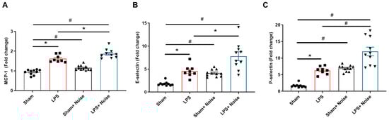 Comparison of proteins associated with BBB disruption in hippocampal tissue. Levels of (A) MCP-1, (B) E-selectin, and (C) P-selectin were measured in 4 groups (n = 8~11 per group). The noise group and LPS-treated group showed significantly increased MCP-1, E-selectin, and p-selectin levels compared to the sham control group, (p < 0.05). The LPS-treated + noise exposure group showed significantly increased MCP-1, E-selectin, and P-selectin levels compared to the LPS-treated group (p < 0.05). *p < 0.05 and #p < 0.001.