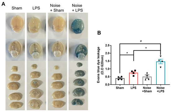Evaluation of BBB permeability. (A) Representative whole brain and coronal sectioned brain images of Evans blue extravasation in the various groups and (B) quantitative analysis of Evans blue leakage (n = 4 per group). The remaining groups showed significantly increased Evans blue extravasation (p < 00.5) compared to the sham control group. The LPS-treated + noise exposure group showed significantly increased Evans blue extravasation compared to the LPS-treated group (p < 0.05) (n = 3). *p < 0.05 and #p < 0.001.