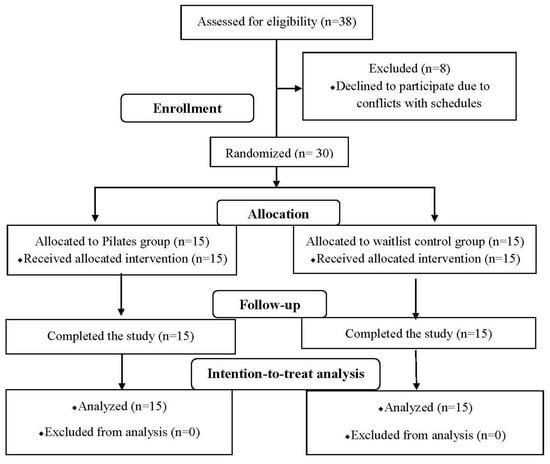 The study was a randomized controlled trial conducted from April 2021 to March 2022. The study complied with the guidelines of the Consolidated Standards of Reporting Trials (CONSORT) [30]. Recruitment was conducted by posting a research flyer on various social network service platforms (https://www.daangn.com/ (accessed on 1 May 2021), Instagram, Facebook, University community) in Seoul, Republic of Korea. A total of 38 participants were screened for eligibility based on inclusion and exclusion criteria. The CONSORT flowchart of the study is presented in Figure 1. Thirty subjects were enrolled in the study and randomly assigned to either the Pilates experimental group (n = 15) or the waitlist control group (n = 15) using a lottery method for sample randomization. In the order of study enrollment, subjects chose a sealed and opaque envelope from a box containing ten envelopes. Their group assignment was determined by the labeled paper inside the envelope, indicating either number 1 (Pilates group) or number 2 (control group). The box contained ten envelopes, with five labeled as number 1 and five labeled as number 2.