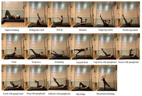 The Pilates program was conducted at a private Pilates center in Seoul, twice a week at 8 PM, with each session lasting 50 min. The Pilates exercises were performed as group exercise classes with participants wearing face masks, following the guidelines necessitated by the COVID-19 pandemic. Each class consisted of 5 subjects. The program consisted of a warm-up exercise and a series of mat Pilates exercises [20]. The warm-up exercise included 6 foam roller stretches, which consisted of head tilt, supine back rolling for the upper and lower back and sacrum, calf stretch, and serratus anterior stretch. The series of 17 mat Pilates exercises, designed to relax and strengthen the back, abdominal, and pelvic muscles, were performed as presented in Figure 2 [32,33].