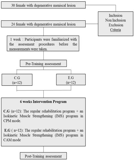 This study was randomized controlled and following initial testing, our study population was randomized into two groups. Randomization and allocation to groups were conducted using a random number generator based on the type of procedure undergone (Figure 1). The control group (CG) performed a regular rehabilitation program performed twice a week containing a variety of physical exercises for muscle strengthening, joint mobilization, agility and stretching followed by an isokinetic muscle strengthening (IMS) program in the continuous passive motion (CPM) mode, in which the knee moves through the range of motion in concentric mode with machine assistance. The regular program lasted approximately 60 to 90 min for each session. Each session included 20 min of warm-up, 35 min of strengthening and neuromuscular exercises and 5 min of cool down (active recovery). All the exercises were carried out at the rate of 3 sets of 10 repetitions in the first week, and then an increase in the additional load or surface change of each exercise was effected, during week 2 to week 12. The rest period was 30 s between sets for the first four weeks, and 30 s to 1 min from the fifth week []. The recovery time between exercises was 3 min throughout the 12 weeks. Furthermore, based on the study of [], ten exercises were included in this program and were performed in the following order: squat, single-leg squat, step-up, knee stability in pull loop, hamstring on fitball, single-leg knee extension, skating, limping cross, heel raises and heel dig bridging. The program adhered to the principles of load training progression for beginners and intermediate middle-aged people. The experimental group (EG) performed the same regular rehabilitation program and an IMS program in the active motion (AM) mode by using maximum intensity concentric contractions of knee extensors and flexors (at 60°/s and 180°/s angular speeds, respectively), with an articular amplitude of 80° [].