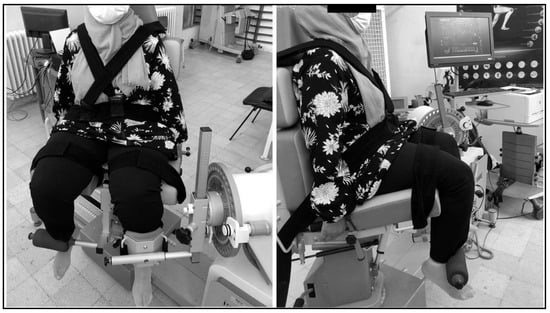 We used an isokinetic dynamometer of the isoforce type (TUR GmbH, Germany) to assess muscle strength. The subject was instructed to be seated with their back at 90° with an adjustment seat for thigh length during examinations (Figure 2). The rotation center of the knee joint, namely the lateral epicondyle of the femur, was visually aligned with the dynamometer axis’ laser projection. With a resistive padded counter-bearing placed downstream of the leg, and three fingers from the lateral malleolus without disrupting the ankle’s range of motion, the assessed limb was firmly attached to the lever arm of the dynamometer. The thigh, pelvic girdle, and trunk were tightly strapped to avoid compensation. The patient had to perform maximal knee flexions/extensions in the concentric mode at two angular speeds, 60°/s and 180°/s for each leg, always starting with the dominant side/leg. A specified warm-up was carried out beforehand for the patient to become comfortable with the activity after correcting the gravity torque and adjusting the mechanical stops of the dynamometer adapted for a “Range of Motion” (ROM) of 80° [,]. Each test consisted of five submaximal warm-up contractions followed by five maximum evaluation contractions, with a 30s rest time between the warm-up and the assessment. The recovery time between the two angular velocity tests was 4 min. The isokinetic parameter retained for the analyses was the peak torque related to body weight. During testing, the investigator provided vocal instruction and directions.