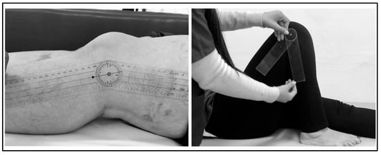 Knee flexion and extension (amplitude) joint ranges were measured using a goniometer by centering it on the knee’s lateral condyle and aligning one arm of the goniometer along the femur axis toward the greater trochanter and the other along the leg toward the lateral malleolus in the supine position [,] (Figure 3).