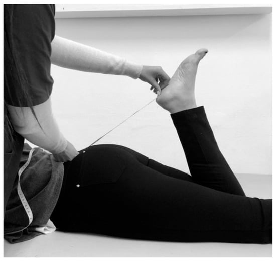 Heel-to-buttock distance (HBD) was measured to detect potential loss of muscle size or reduced flexibility, primarily of the quadriceps []. The examiner passively bended their knee and used a meter tape, to measure the HBD increase in cm (Figure 4).