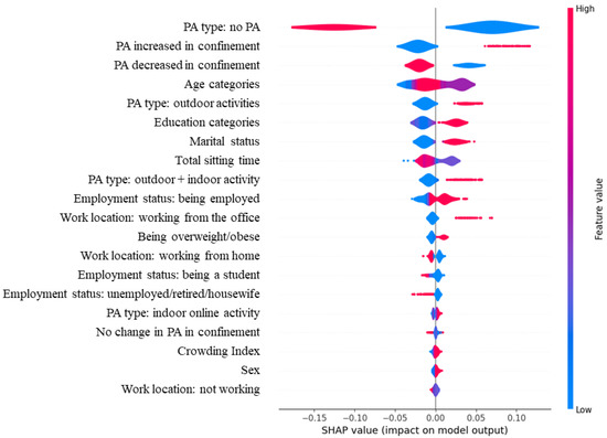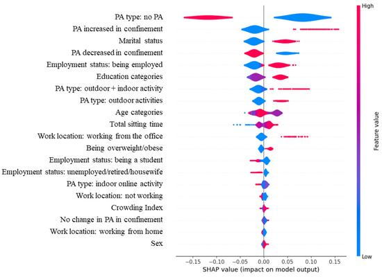 Finally, the results of the statistical analysis of this study showed that PA level and intensity during lockdown increased with age, after adjusting for sex, work location, BMI, and crowding index, whereas sitting time decreased with age. This might be explained by the fact that the younger subjects included in our study were students, so they were probably spending most of their time during weekdays following their university courses online, in addition to spending more screen time on entertainment purposes, and hence becoming less active. Conversely, older adults probably had more free time to spend doing less sedentary activities during the lockdown period. Findings from machine learning and SHAP analysis confirmed the trend observed among younger participants. As for the older age categories, the findings were less consistent, given that the contribution of the age factor to the whole model was mostly predominant among participants aged 24–39 years. The trend that we observed as being associated with age was not evident in other studies, despite some findings about an increase in leisure-related PA during lockdown among people who were already involved in training, and who gained more time to exercise at home [9,11]. Further studies are needed to investigate PA and lifestyle behaviors among older age groups during lockdowns. No significant differences were observed among sex categories concerning the PA change during lockdown in our study, except for a higher sitting time found among men. This was confirmed by SHAP analysis, where sex remained in the lowest levels of contribution to the whole model’s prediction of a total PA ≥ 600 MET·min/week. Accordingly, only a few studies have previously reported sex differences, specifically, a larger decrease of PA among men during lockdown, as compared to pre-lockdown activity [10,11,13]. Regarding BMI categories, no statistically significant differences were observed. In SHAP analysis, the effect of being overweight/obese was not impactful; however, it was in the middle of potential factors relative to the features’ importance level. With many studies in the literature showing that a higher BMI was constantly associated with a lower PA level [36], many reasons could explain the insignificance of the association found here, namely the cross-sectional design of the study, and the limited number of participants in each of the BMI categories to allow for more detailed analysis.