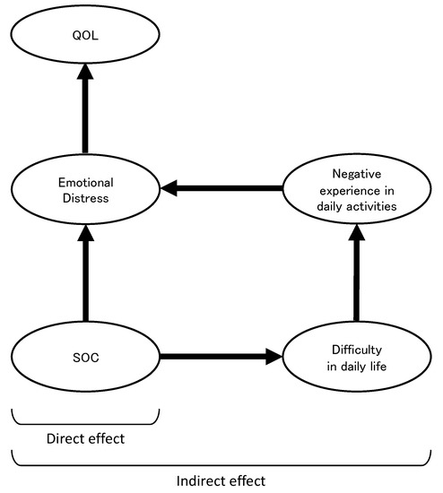 The hypothesis model. A hypothetical model of QOL in survivors of breast cancer includes the direct effect of “SOC” to “Emotional Distress” to “QOL” without mediating variables, and the indirect effect of “Difficulties in daily life” to “Negative experiences in daily activities” as mediating variables. QOL, quality of life; SOC, sense of coherence.