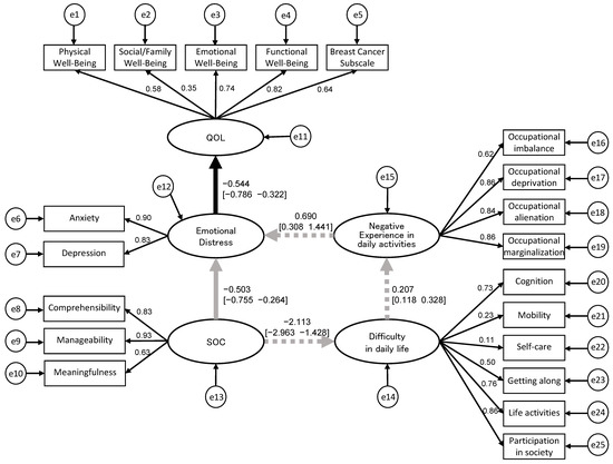 However, the structural relationship between difficulty in daily life and occupational dysfunction (negative experiences in daily activities) in the QOL of patients and survivors of breast cancer has not been investigated. Therefore, we developed a hypothetical model to construct a structural equation model of QOL based on difficulty in daily life, considering that difficulty in daily life and negative experiences in daily activities are included as variables in QOL (Figure 1). The hypothesized model was based on direct associations leading from “SOC” to “emotional distress (anxiety and depression)” and from “emotional distress” to “QOL”, which have already been shown in previous studies, and the additional structural relationships leading from “SOC” to “emotional distress” to “QOL” as mediated by “difficulty in daily life” and “negative experiences in daily activities.” Bayesian structural equation modeling (BSEM) was used to investigate the effectiveness of this model. If validated, this structural model could provide a basis for the development of support strategies to increase a survivor’s QOL by alleviating difficulties in daily life and improving negative experiences in daily activities. Thus, the purpose of this study was to clarify the structural relationship of QOL in survivors of breast cancer, including difficulty in daily life and negative experiences in daily activities as health-related indicators.
