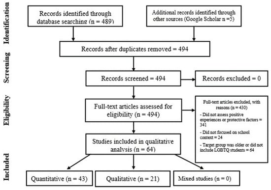 After conducting the search, 489 articles were found through EBSCOhost. The platform automatically eliminated duplicated results. Five additional articles were added, resulting from references included in some of the screened articles. A checklist template was created to assess the presence of the following features: title, country of origin, and year of the study; being an empirical study; the assessment and type of protective factor or positive experience of LGBTQ+ students; the inclusion in the sample of LGBTQ+ students from secondary schools; the study methodology; and finally, the main outcome related with this systematic review’s purpose.