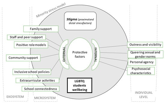 In accordance with Brofenbrenner’s ecological systems theory [10], two subtypes of external protective factors associated with the school microsystem were identified: inclusive school policies and extracurricular activities. The second sub-group includes external protective factors that are linked with social support, both from school elements (such as teachers and other school staff, supportive counselors, and colleagues), from family, and within the community (the school environment but also its surrounding context, namely the presence of inclusive resources and access to positive role models, as well as a supporting local culture, including state-level policies). School connectedness is another theme that translates into an overall positive school climate and is in itself a protective dimension. These are protective elements that concur with the minority stress model [11,12] vision of factors that promote resilience in the presence of risk factors such as social and cultural bias and discrimination.