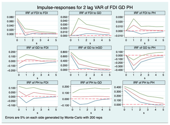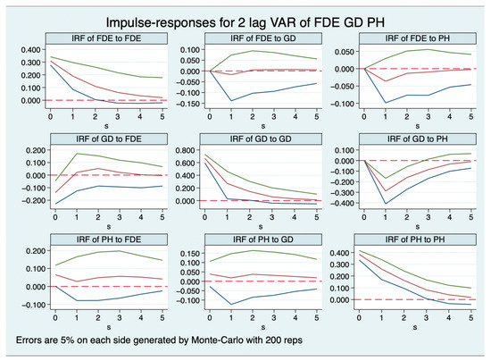 The panel vector autoregression (PVAR) model, an advantageous fusion of panel data and vector autoregressive models, is capable of addressing the endogeneity issues and lag periods of variables, thereby facilitating the study of variable interactions [53]. To accurately examine these interactions and impacts, this paper employs the PVAR model for a robustness test, analyzing the evolutionary characteristics of fiscal decentralization, local government debt, and public health in China.