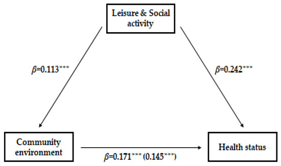 Direct and indirect effects of community environment, leisure and social activities, and health status. *** p < 0.001.