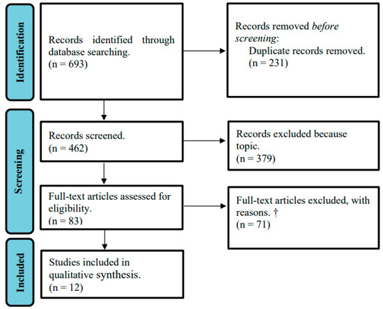 We identified 693 articles in the initial search. After duplicates removal, 462 articles were screened by title and abstract. Then, 83 were screened based on full text analyses, of which 12 were included in the final study. These results are described in the PRISMA diagram, which provides an overview of studies identified at each stage of the search (Figure 1).