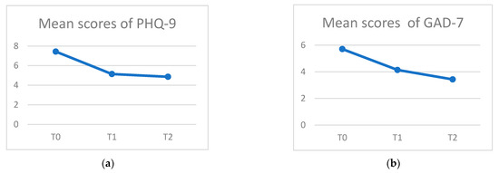 Mean scores of PHQ-9 and GAD-7 over time: (a) mean scores of PHQ-9 at T0, T1, and T2; (b) mean scores of GAD-7 at T0, T1, and T2.