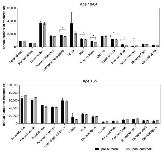 Mean as well as standard deviation per year of fractures for the pre- and post-outbreak period for patients 18–64 years (upper panel) and for patients > 65 years (lower panel). The mean fracture values of the different fracture types before and after the onset of the pandemic outbreak were analyzed via a t-test (* p ≤ 0.01). Data are given as mean ± standard error of the mean. The relative change in the fractures and the level of significance are displayed in Table 1.