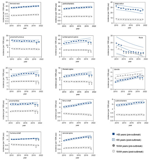 For the pre-pandemic period, linear regression analysis was used to model the incidence rate over time (Figure 2). There was a significant linear relationship for all fracture types in the elderly population, with most fracture types indicating a significant upward trend (p = 0.000–0.006), except for distal radius and fibula fractures, which experienced a significant downward trend. Extrapolation of the pre-pandemic 99% prediction intervals to the post-outbreak period showed a significant drop in the observed fracture incidence in the elderly for the (1) proximal humerus, (2) lumbar spine/pelvis, (3) ribs, (4) thoracic spine, (5) clavicle, (6) proximal tibia, (7) humeral shaft, and (8) cervical spine fractures (Figure 2).