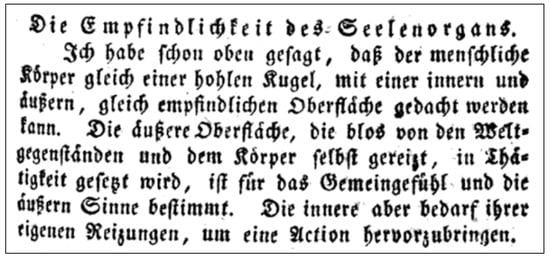 In the text written in 1811 by Johann Christian Reil, he compares the body to a hollow sphere; the outer surface is stimulated by the outside world and is responsible for the “common feeling” (i.e., coenaesthesia), and the inside of the sphere performs its own stimulation: “The sensitivity of the soul organ. I have already said above that the human body can be thought of as a hollow sphere, with an inner and outer surface of equal sensitivity. The outer surface, set in motion merely by the objects of the world and the body itself, is intended for the common feeling and the outer senses. But the inner needs its own stimuli in order to produce an action”.