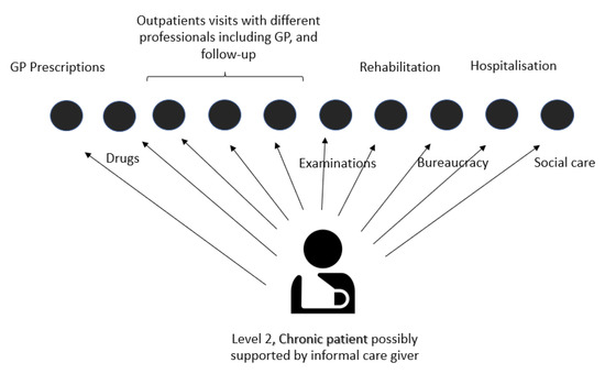 The region first introduced an integrated patient DataWareHouse, in 2002 (Banca Dati Assistito, BDA), including the health-related information useful to track the patient history of care across the providers where he or she was assisted, monitoring process and disease outcomes [34] (pp. 18–21). After a dedicated algorithm was developed and two pilot experimentations were run [39], a population health stratification similar to Kaiser Permanente’s was adopted, in 2017, to define five levels of resource-intensive care need (Table 2), and drive the proactive recruitment of patients in dedicated care pathways of varying complexity.