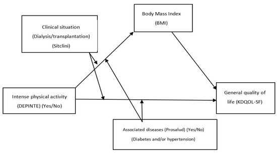 No empirical evidence was found showing the mediating action of the body mass index (BMI) on the relationship between intense physical exercise and quality of life variables. Research by Hyun et al. (2019) demonstrated, through a study with 1880 participants, that waist circumference is a better indicator of quality of life and physical component than BMI, without obtaining a mediating relationship of BMI as the one conducted in this study [65]. The scientific literature identifies BMI as a factor associated with an increased risk of end-stage CKD and a decrease in quality of life [13,66], but there are no studies on its mediating effect. Neither is there a verification of the existence of an interaction between the clinical situation and associated diseases with the intense practice of exercise on general quality of life, which would help indicate in which specific conditions it is more effective. However, it could be concluded that the regular practice of sport and intense physical activity reports better indices of quality of life in general for all the patients analysed.