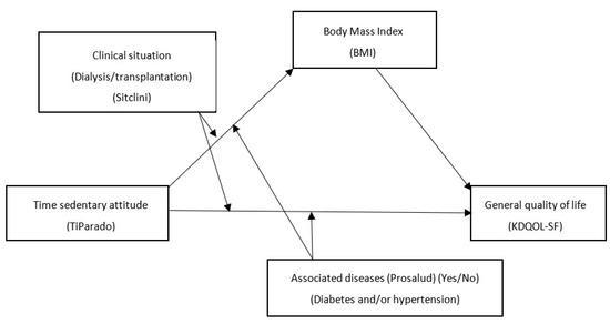 With respect to the results of the moderate mediation models, in which the predictor variable was the time in sedentary attitude, it was found that, in this case, the body mass index (BMI) does act as a mediator variable in the association with the general quality of life. In other words, being active influences the BMI by reducing it and, through that, improving the general quality of life. BMI is higher in those on dialysis and even greater for those on dialysis and inactive. It is difficult to find in the literature the mediation of BMI on quality of life, although there are studies showing that obesity is associated with changes in the body in renal function, hypertension, hyperglycaemia, dyslipidaemia, and atherosclerosis [22,23]. Therefore, it could be said that the less sedentary the patients are, the more the parameters related to BMI and obesity will be positively modified, and we should expect them to have a higher quality of life. This will have a greater effect on dialysis patients because they are more sedentary due to their changed life plans with less participation in active life [15,16].