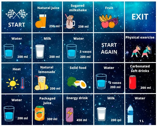 Childhood overweight and obesity continue to increase. In the particular case of Spain, according to the data from the latest Nutritional Study of the Spanish Population (ENPE), almost 40% of children between 3 and 8 years of age suffer from these problems. The figures are not much more encouraging if adolescents and young people are also considered. Thirty-four percent of the population between 3 and 24 years of age suffer from overweight or obesity, with the majority being boys: in them, this prevalence rises to 39.2%, while in girls it is 28.4% []. Within this problem, one of the main risk factors is the excessive intake of sugary drinks, to the detriment of the recommended healthy consumption of water. Therefore, one of the main focuses of public health should be to implement interventions that promote the hydration habits of the young general population []. These prevalence data may have been aggravated as a consequence of the COVID-19 pandemic and confinement, assumed as the main factors of a sedentary lifestyle and inadequate diet, mainly through the inadequate intake of sugary beverages and soft drinks, as a consequence of the lack of education on healthy eating habits [].
