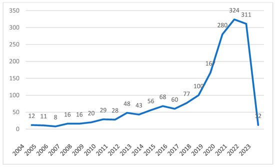 Figure 1 illustrates the change over time in the number of articles published in the field of CM related to intelligent knowledge services. Between 2004 and 2008, research on CM in the field of intelligent knowledge services was at its initial stage of development. There are relatively few theoretical and methodological research results for CM knowledge in digitization and intelligence, and no more than 20 academic papers are published each year. From 2009 to 2017, the number of research results on CM intelligent knowledge services fluctuated slightly, but the overall trend was a gradual increase, with a more significant growth rate. Between 2018 and 2021, research on CM intelligent knowledge services developed rapidly, with a substantial increase, and the research theory and methods were relatively mature, reaching a peak of 324 articles in 2021. The number of articles published in 2022 decreased slightly. The research results for 2023 are from only January and February, with a relatively small number of retrieved papers, so their analysis is not presented in this article.