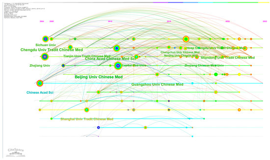 In our study, we analyzed the publication trends of CM knowledge services across 381 institutions. As depicted in Table 1, the average number of articles per institution was 4.42. Notably, the top 20 institutions stood out, collectively publishing 961 articles with an average of 48 articles per institution, surpassing significantly the overall average. Beijing University of Chinese Medicine, Chengdu University of Traditional Chinese Medicine, and China Academy of Chinese Medical Sciences emerged as the three most prolific institutions in terms of publication volume, indicating their prominent position within the field. These institutions also exhibited high centrality. Furthermore, assessing the level of collaboration between research institutions serves as an important indicator for evaluating the research landscape in a specific domain [35]. As shown in Figure 2, it demonstrates that there is close cooperation among the institutions. Figure 3 shows the timeline for institutions to start research on CM knowledge services.